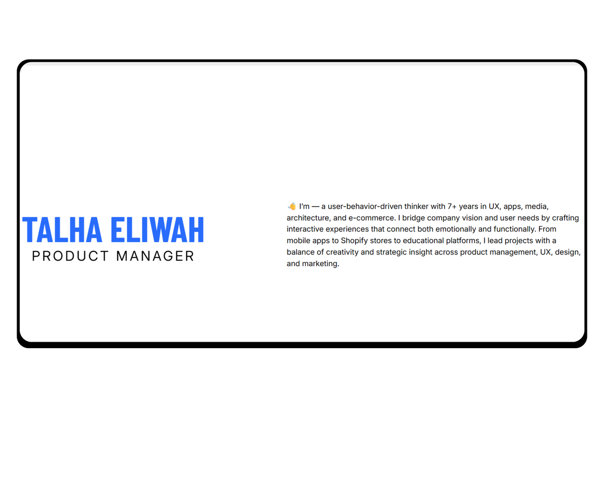 👋 I’m — a user-behavior-driven thinker with 7+ years combined in UX, apps, media, and managmnet. I bridge company vision and user needs by crafting interactive experiences that connect both emotionally and functionally. From mobile apps to Shopify stores to educational platform, I lead projects with a balance of creativity and strategic insight across product management, UX, design, and marketing.